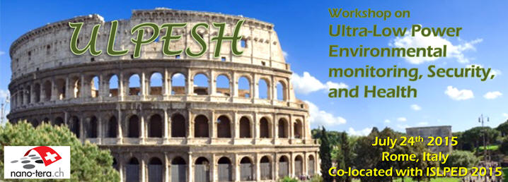 The Nano-Tera Workshop on Ultra-Low Power Environmental monitoring, Security, and Health, will be held in Rome, Italy on Friday July 24th 2015, following right after the last session of the ISLPED 2015 conference. Nano-Tera is a Swiss research initiative that supports interdisciplinary research projects that use engineering and information technology to improve health and security, and to broaden our management of energy and the environment. Many of these projects rely heavily on low-power electronics and design and include a significant amount of research in this area. They are therefore well aligned with the focus of the ISLPED conference.