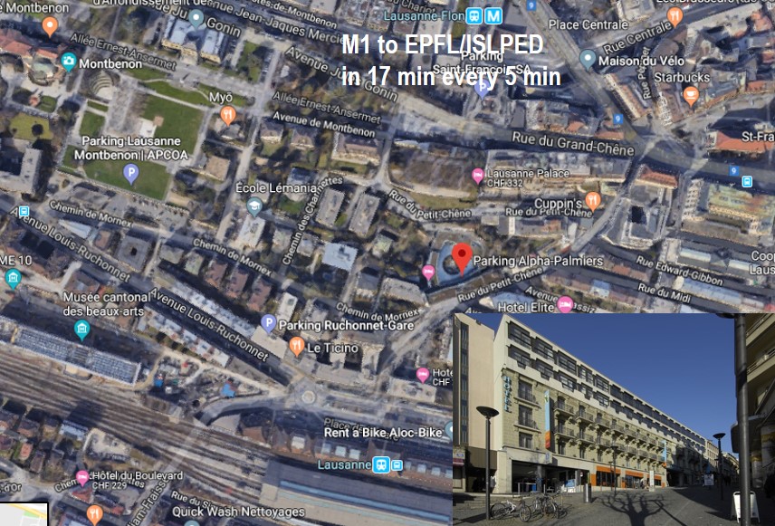 The Alpha Palmier Hotel is located in the center of Lausanne, at 5 min. walking distance from central train station and from the city center, as wel as from the Metro M1 which takes you directly to the converence venue (EPFL).
